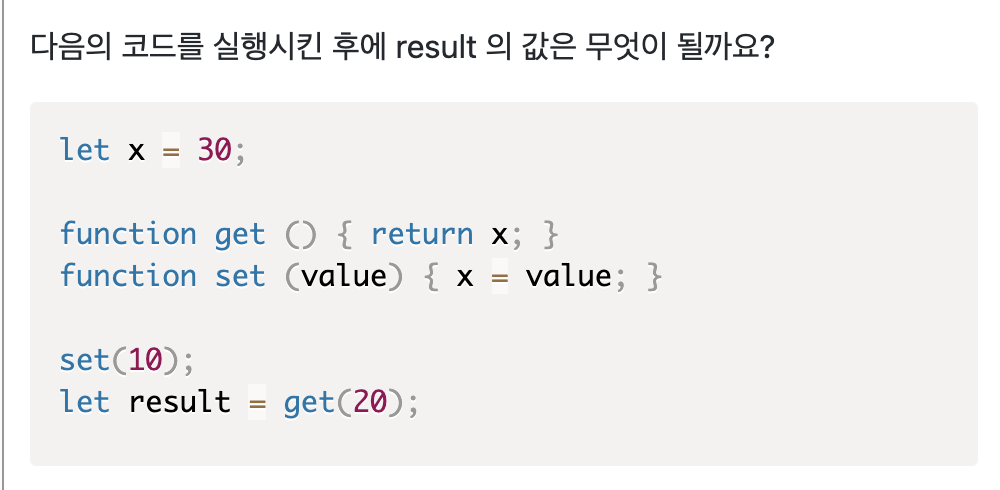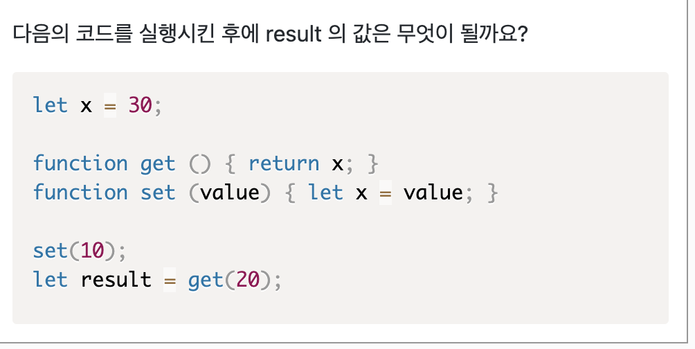 이에 반해 set 함수 x에 변수 선언이 된다면 이거는 전역 변수 x와 지역 변수 x는 다르기 때문에 값이 30 그대로 출력된다.
