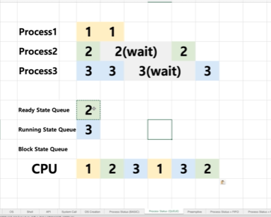 시분할을 베이스로 순서대로 시작하고 레뒤큐에서 대기를 한 상태에서 CPU에서 처리함.